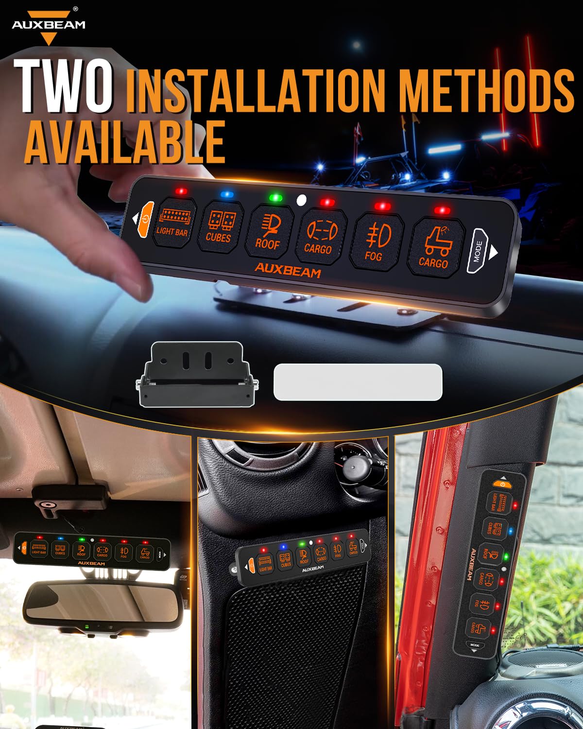 Multifunctional Switch Panel: Auxbeam 6 gang switch panel Slim Switch Panel features 3 lighting modes. TOGGLE (red light indication, which provides steady and constant lighting), MOMENTARY (blue light indication, only works when a switch is pressed, like a horn), and PULSED (green light indication, allowing you to control the flashing frequency of your lights or devices, creating a strobe effect). The memory function retains your settings for quick device access.