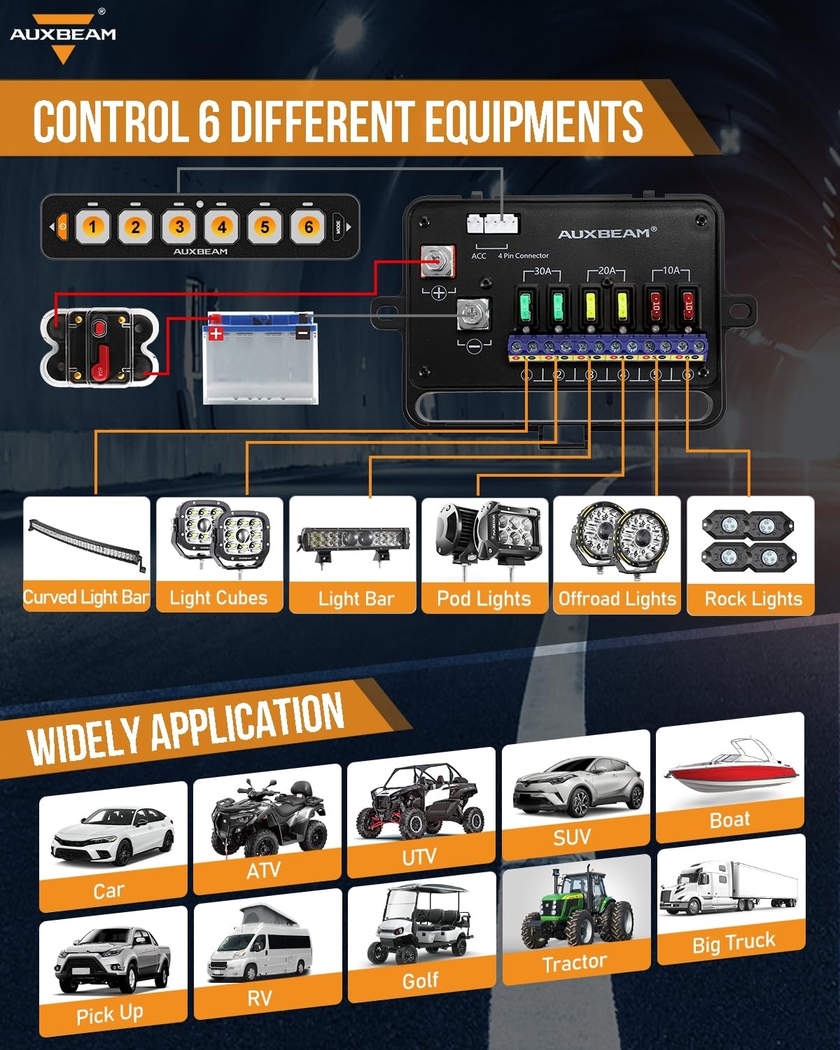 Specification: IP65 waterproof rating. Operating voltage: DC 12-24V. Max power: 720~1400W. Maximum Current : 60A.Temperature range:-40~221°F. 3 years warranty by Auxbeam.